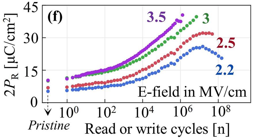 Die Anwendung quasi-statischer C-V-Messungen zum Auslesen von FeCAPs ist jedoch keine schaltkreisfreundliche Leseoperation. In einem letzten Schritt haben die Forscher gezeigt, dass dieselben Informationen durch Anwendung eines pulsierenden Leseschemas und Auslesen von Ladungen abgerufen werden können, was bei Speicheroperationen üblicher ist. Mit diesem Leseschema erreichten sie >1011 nichtdestruktive Lesezyklen bei einer Vorspannung von 0 V DC, ohne dass das elektrische Feld, bei dem die Polarisation wechselt (d.h. das Koerzitivfeld), angelegt werden muss. Dieses Schema ermöglicht eine vollständige Entkopplung der Lese- von den Schreibzyklen.